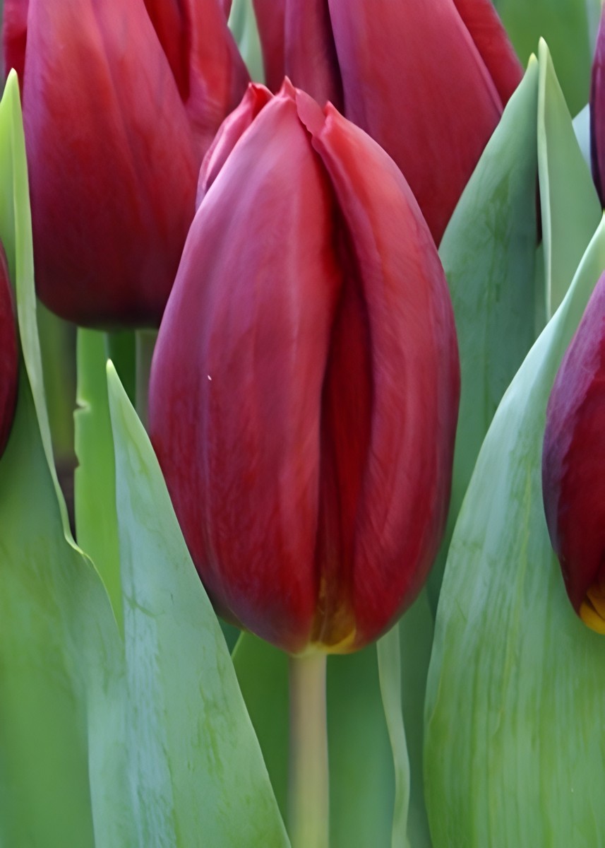Тюльпан Стронг Лав относится к классу «Триумф» и переводится как «Сильная любовь». Удивительная окраска этого гибридного тюльпана сделает его украшением любого участка. Глубокий темно-бордовый оттенок основания ближе к верху лепестков переходит в насыщенный алый. Высота растения достигает 40 см. Бутон крупный, бокаловидной формы, малиново-красный, занимает до 9 см, его лепестки гладкие и маслянистые. При цветении цветки полностью не раскрываются, лишь немного овально расширяясь. Удлиненные, заострённо-яйцевидные лепестки хорошо сохраняют форму бутона. Период цветения с конца апреля и до середины мая. Сорт устойчив к неблагоприятным условиям, хорошо переносит ветреную и дождливую погоду. Выигрышно смотрится яркий цвет тюльпана на фоне насыщенной зелени широкой листвы. Эти тюльпаны роскошно будут смотреться в цветниках в сочетании с другими многолетними растениями. Луковицы садовых тюльпанов рекомендуется выкапывать каждый год. Место посадки тюльпанов лучше менять 1 раз в 4-5 лет.