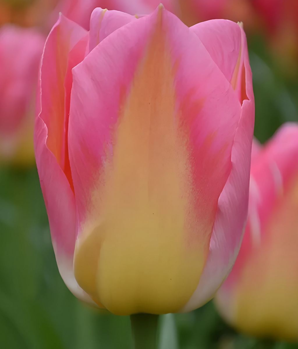 Том Пус - тюльпан класса «Триумф». Окрас цветка изначально сливочный с розовой окантовкой по краям, потом кант становится ярко-розовым, постепенно переходит в коралловый, а затем уходит в оранжево-жёлтый. Размер цветка 6–7 см. Высота 40–45 см. Период цветения: апрель — май, аромат у сорта средний. Требования к свету: солнце. Культура не требует выкапывания на зиму. Сорт неприхотливый и болезнеустойчивый. Тюльпан Том Пус подходит для срезки, так как никогда не раскрывается полностью, сохраняя форму бутона до двух недель. Также подходит для посадки в открытый грунт, патио, террасы, балкон, горшки, в ландшафтном дизайне используется в бордюрах, альпинариях, на клубмах и в групповых посадках.