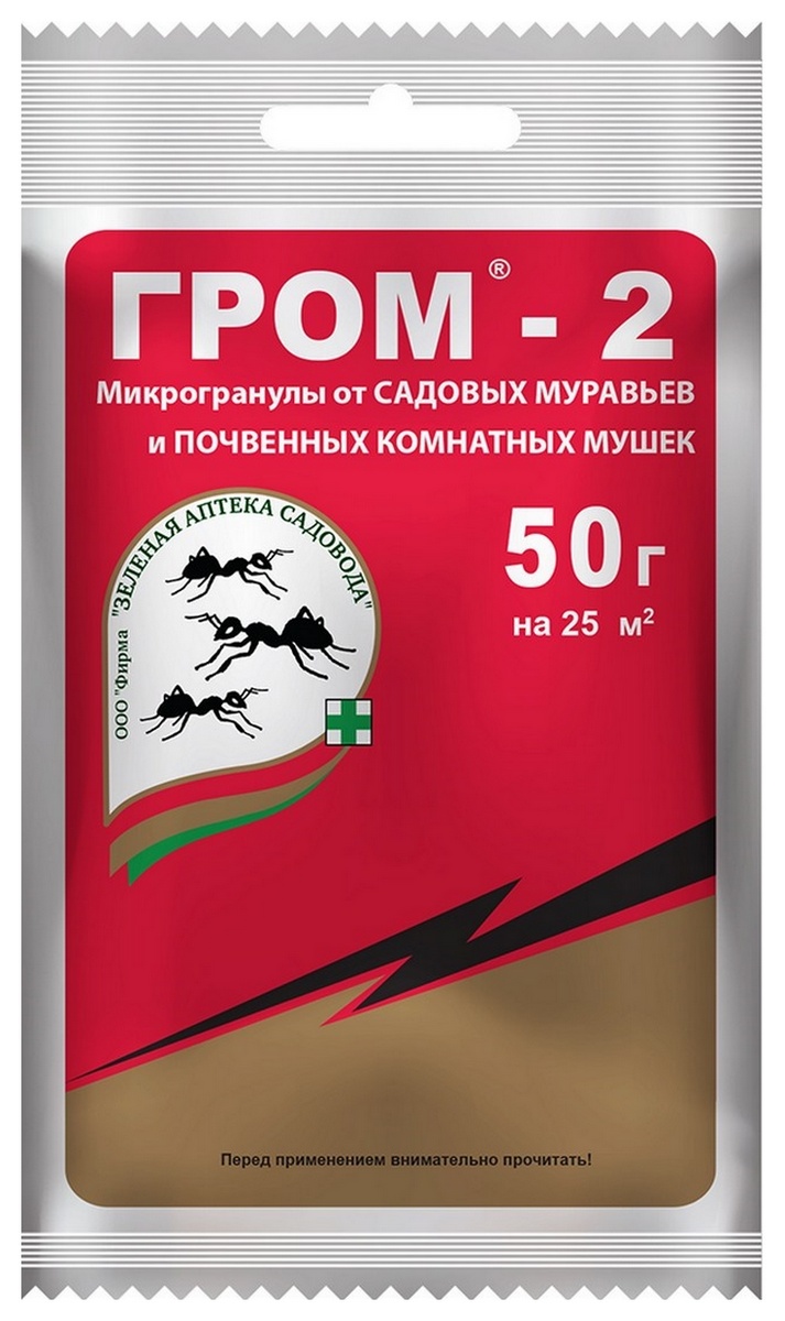 Инсектицид Гром-2 - готовое к применению средство для борьбы: с садовыми муравьями на грядках, под деревьями и кустарниками, в теплицах, около строений; с почвенными мушками и грибными комариками на горшечных цветочных растениях и рассаде цветочных культур. Препарат отлично проникает в муравьиные ходы, муравьи гибнут на следующий день после обработки. В горшках Гром-2 уничтожает личинок почвенных мушек, живущих в почве. Препарат удобен в применении и обладает длительным защитным действием (более месяца).