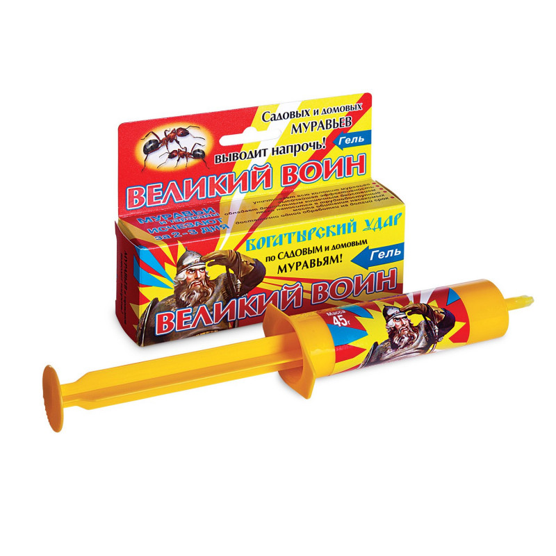Гель предназначен для борьбы с садовыми и домашними муравьями. Является приманкой с двумя веществами, губительными для муравьев. Специальный состав ее так привлекателен для насекомых, что рабочие особи не только охотно поедают ее сами, но приносят в муравейник и кормят личинок. Благодаря этому уже через несколько дней погибает вся муравьиная колония. Гель "Великий Воин" не портится, не высыхает и не теряет своей эффективности в течение нескольких месяцев после применения. Это гарантирует надежную защиту от муравьев на полгода и дольше. Гель удобен в применении, легко наносится даже в труднодоступные места. Не имеет неприятного запаха, не выделяет в воздух вредных веществ и может применятся людьми, страдающими аллергией или астмой.