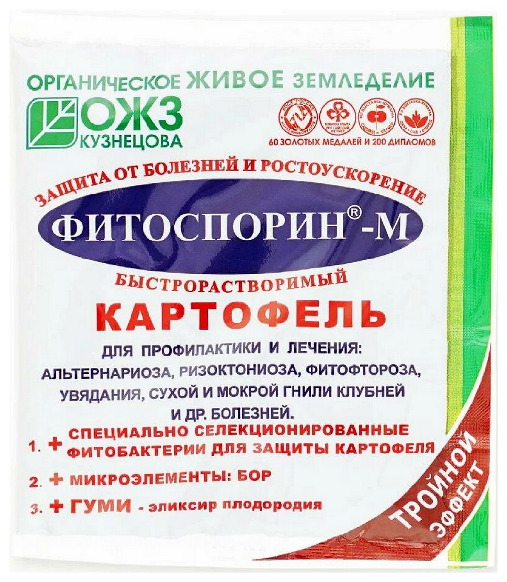 Биофунгицид, в основе которого – отселектированные, отобранные природные фитобактерии от болезней картофеля в споровой форме, проникающие в ткани растений и вырабатывающие биологически активные вещества для их защиты и стимуляции. Защищает от фузариоза, гнилей, чёрной ножки, фитофтороза, ризоктониоза, серебристой парши, альтернариоза, фомоза, вертициллёзного увядания и других болезней картофеля. Абсолютно безопасный для здоровья человека и животных, но при этом не уступающий по силе химическим, препарат. Не вызывает привыкания у вредных микробов, служит как для профилактики, так и для лечения основных болезней растений. Обладает пролонгированным действием. Обогащен самыми необходимыми микроэлементами для картофеля – Mo, Cu, В. Оздоравливает почву.
