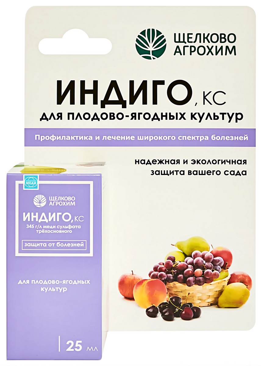 «Индиго, КС» – медьсодержащий препарат нового поколения, предназначенный для борьбы с комплексом болезней на плодово-ягодных культурах. Ионы меди попадают в клетки фитопатогенных спор и начинают взаимодействовать с ферментами. Как результат, споры прекращают расти и не могут нанести вред растению. «Индиго,КС» – концентрированный препарат в жидкой форме, который не выпадает в осадок. Он безопасен для культур, совместим с другими препаратами. Действие «Индиго, КС» начинается сразу после обработки и продолжается в течение 14 дней в зависимости от погодных условий и инфекционной нагрузки. Максимальный фунгицидный эффект проявляется при профилактическом применении до появления симптомов болезни.
