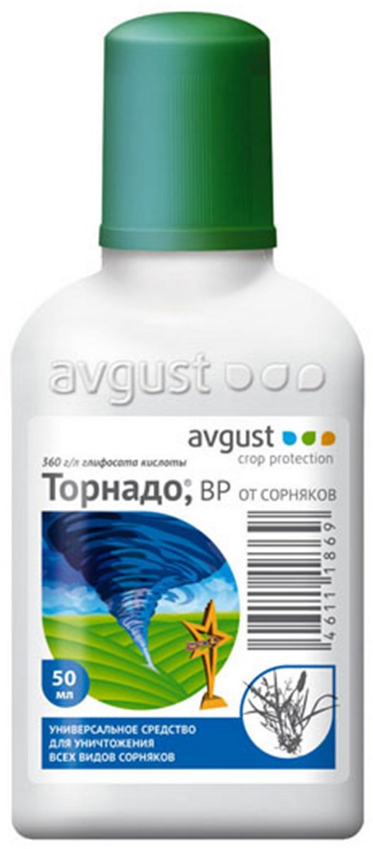 Универсальное средство с повышенной концентрацией действующего вещества от всех видов сорняков. При контакте с сорняком Торнадо 360 проникает в растения через листья и другие зеленые части и переносится по всем органам сорняков, достигая их корневой системы, что приводит к поражению точек роста и полному отмиранию надземных и подземных органов. Через 4–5 дней растения начинают желтеть, а еще через 2–3 недели они гибнут.