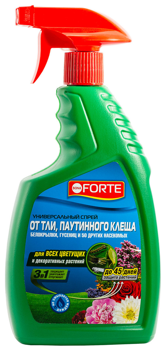 Bona Forte спрей универсальный от тли, паутинного клеща – высокоэффективный инсектицид для защиты от тли, паутинного клеща, белокрылки и гусениц, эффективно борется с рядом других насекомых-вредителей: клещи, майские жуки, совки, долгоносики, цикадки, минирующие насекомые, клеверные клещи, луговые мотыльки, проволочники, трипсы, листоеды, пилильщики и другие насекомые. Применяется на цветах и декоративных кустарниках открытого грунта: розах, пионах, гортензиях, рододендронах, луковичных, сирени, жасмине и других. Препарат защищает от вредителей до 45 дней, устойчив к смыванию осадками.