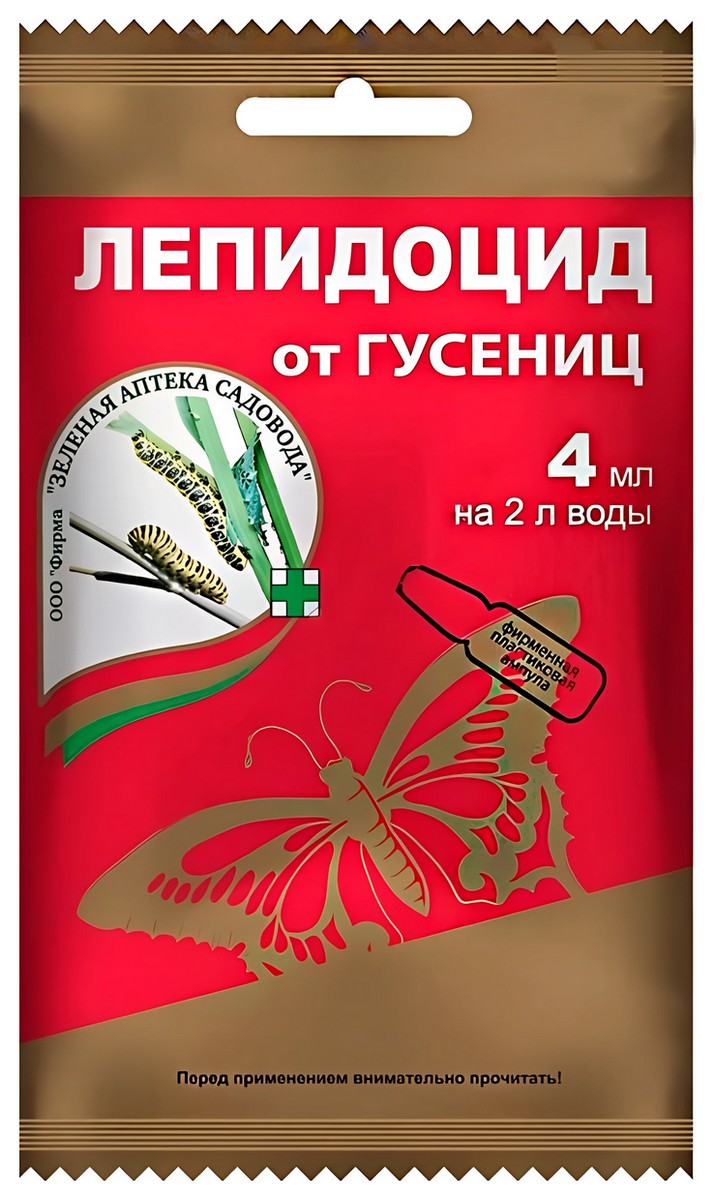 Лепидоцид – биологический препарат, в основе которого споры особого штамма почвенной бактерии Bacillus thuringiensis. Эти бактерии заражают вредителей и в процессе своей жизнедеятельности выделят особый белковый токсин – он попадает в желудок насекомых и постепенно их убивает. Препарат действует избирательно – только против чешуекрылых насекомых. Это все виды молей, мотыльки, совки, огневки, плодожорки, листовертки, шелкопряды, пяденицы, златогузки, огневки и пилильщики. И именно их гусеницы чаще всего портят наш урожай овощей и фруктов. Поскольку Лепидоцид – биологический препарат, им можно обрабатывать растения, на которых уже во всю зреет урожай. Совместим в баковых смесях с химическими пестицидами и биологическими препаратами.