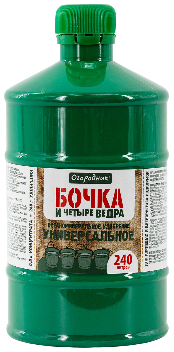 Бочка и четыре ведра универсальное - комплексное жидкое органоминеральное удобрение с микроэлементами. Применяется в качестве корневой подкормки для ягодных, овощных, плодовых и комнатных растений. Препарат является мощным стимулятором роста, увеличивает скорость прорастания семян и продлевает срок цветения, ускоряет процесс созревания плодов, улучшает вкусовые качества продуктов и увеличивает сроки их хранения.
