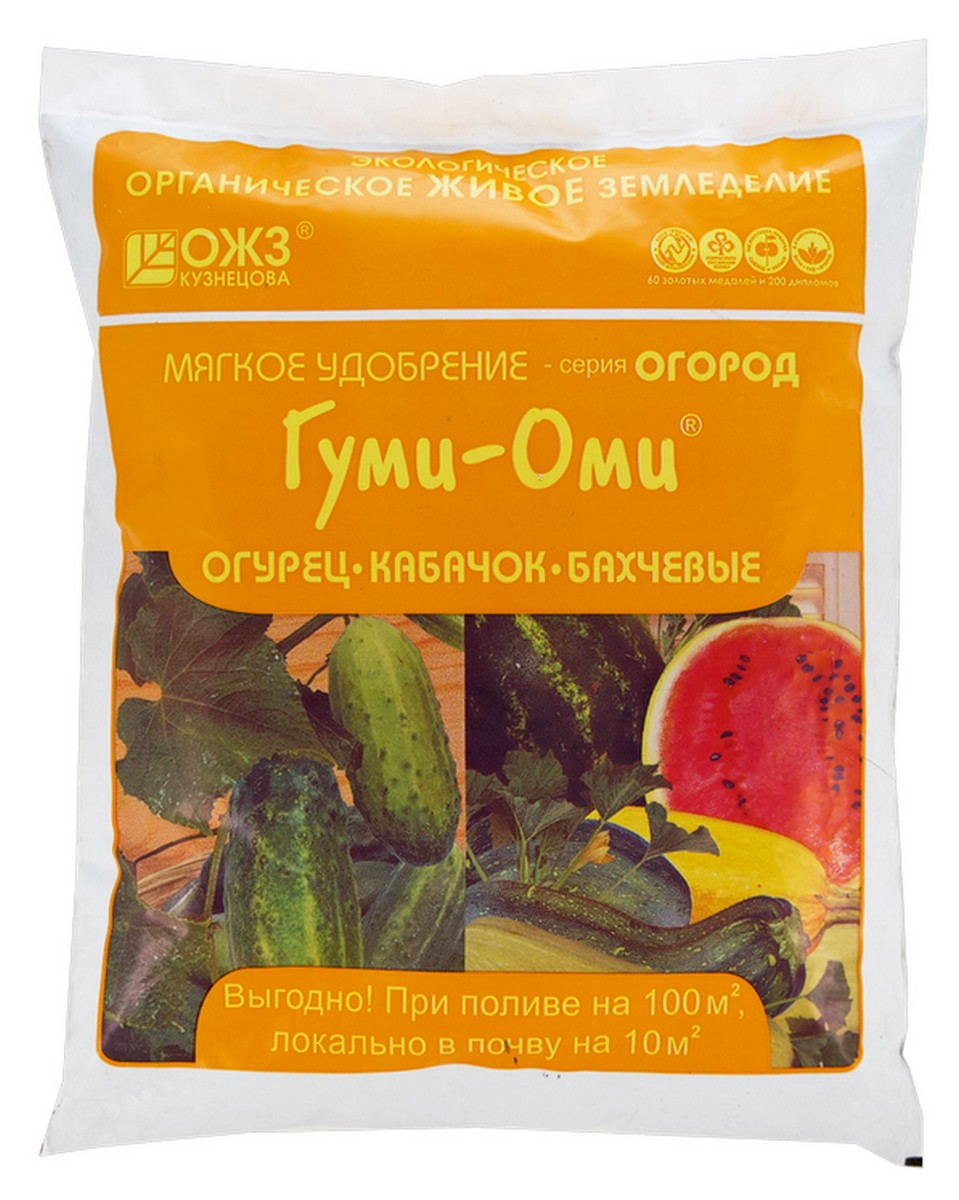 Органоминеральное удобрение с микроэлементами для огурцов, кабачков и бахчевых. Порошково-гранулированное удобрение Гуми-Оми с необходимыми макро- и микроэлементами и эликсиром плодородия Гуми повышает урожайность, плодородие, улучшает качество продукции. Эликсир плодородия Гуми улучшает структуру почвы, укрепляет иммунитет растения, защищает растение от всевозможных стрессов при пересадке, погодных аномалиях, поражении вредителями и болезнями, ускоряет рост и развитие растений. В составе препарата высокоэффективные и быстродействующие природные гуматы с фульвовыми кислотами, которые обеспечивают рост и развитие растения, обезвреживают ядохимикаты и улучшают экологическую чистоту ваших урожаев. Обладает пролонгированным действием. Не содержит хлор. Препарат соответствует технологии ОЖЗ (Органическое Живое Земледелие) – безопасен для здоровья человека и животных