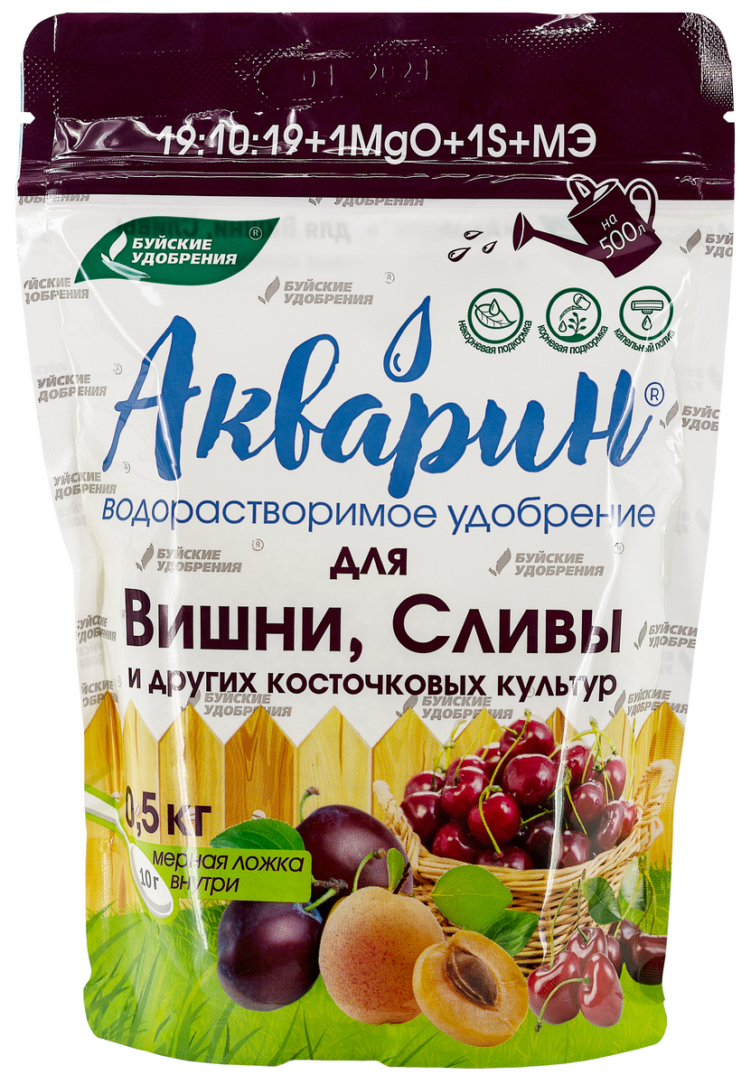 "Акварин" для вишни, сливы и других косточковых культур - водорастворимое удобрение, в состав которого входит азот, фосфор, калий, магний, сера и микроэлементы – железо, цинк, марганец, медь в хелатной форме, а бор и молибден – в минеральной. Благодаря кислой реакции (рН) удобрения, оно легко растворяется в холодной воде и более эффективно усваивается корневой системой или листовой поверхностью растений.