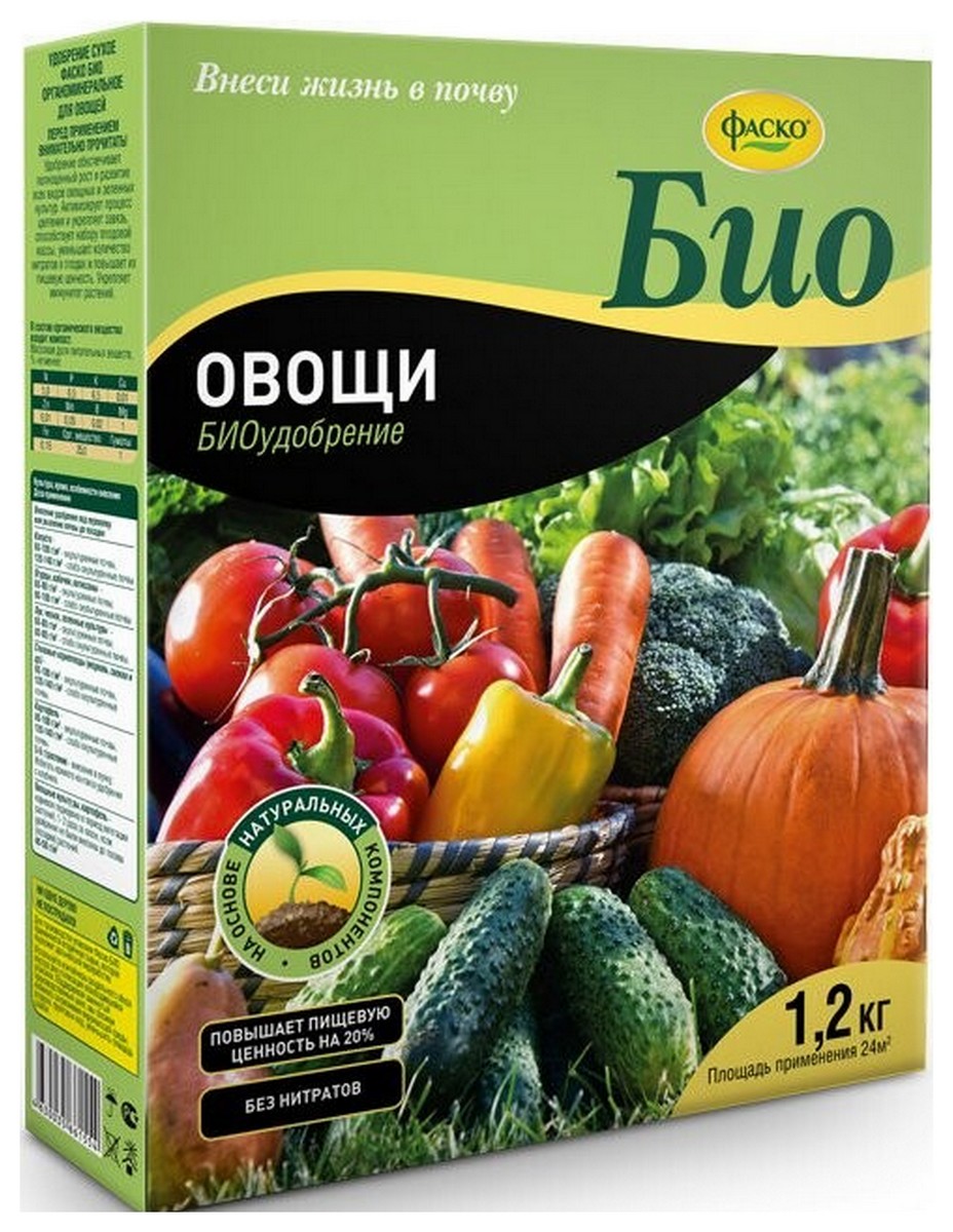 Новый вид комплексных удобрений для Овощей Фаско БИО на основе полезной органики обеспечивает полноценный рост и развитие всех видов овощных и зеленых культур. В состав продукта входят наиболее полезные и легко усвояемые для растений компоненты: конский компост, гуматы – природный стимулятор роста, зола – органический источник калия, другие микроэлементы, благоприятно влияющие на рост и развитие растений, повышение иммунитета и защиты от негативного воздействия окружающей среды.