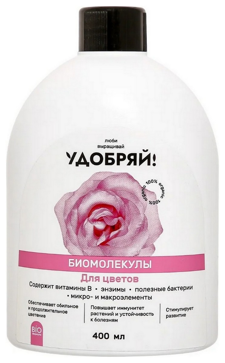 Биомолекулы Удобряй для цветов - уникальный комплекс микроорганизмов и продуктов их жизнедеятельности, обеспечивающий максимальную биодоступность элементов питания для растений. Это рецептуры нового поколения, которые повышают биодоступность питательных веществ в разы, благодаря фосфор- и калиймобилизующим микроорганизмам, начинающим работать в почве уже при +5˚С. Инновационный комплекс питательных элементов природного происхождения, энзимов, аминокислот, витаминов, который обеспечивает беспрерывное цветение, стимулирует рост и развитие растений, увеличивает количество бутонов, повышает устойчивость растений к неблагоприятным условиям окружающей среды, а также повышает иммунитет растений и устойчивость к болезням. 100% биологический продукт, безопасно для сада, дома, пчел и подземных вод.