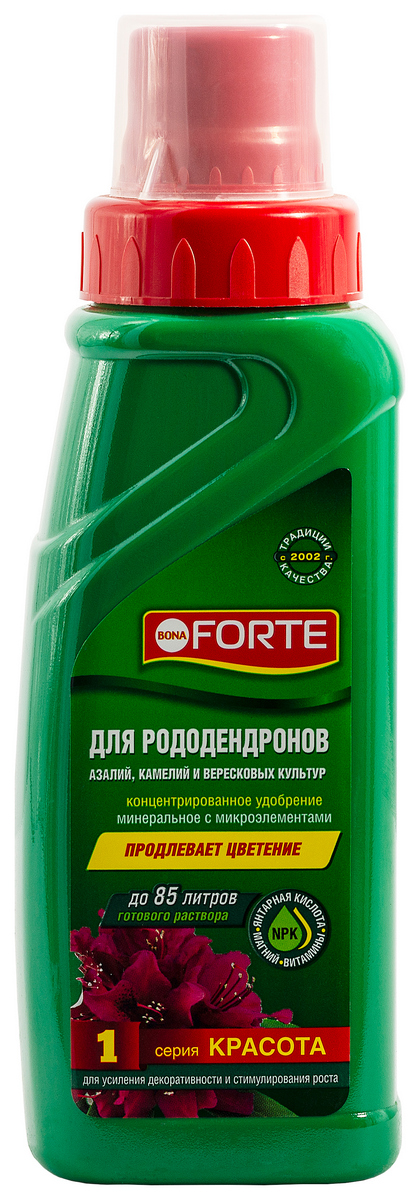 Серия КРАСОТА создана лабораториями Bona Forte для усиления декоративности и стимулирования роста растений. Подходит для азалии, камелии, рододендронов, а также различных вересковых: гаультерии, кальмии, багульника, эрики. Удобрение содержит полный комплекс веществ, необходимых для полноценного и сбалансированного питания растений. Для обеспечения растений всеми необходимыми для жизнедеятельности веществами чередуйте использование минеральных удобрений серии КРАСОТА и органо-минеральных удобрений серии ЗДОРОВЬЕ.