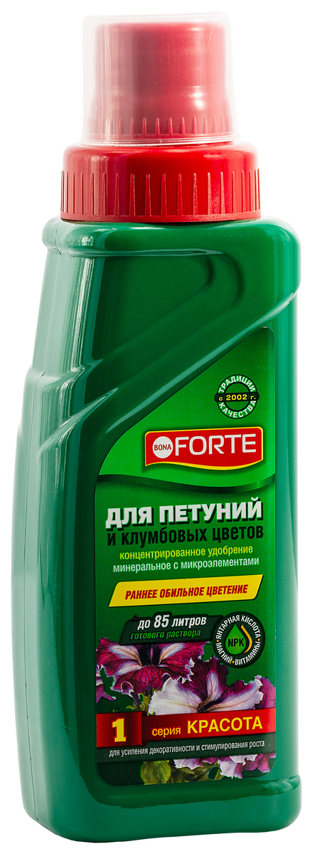 Серия КРАСОТА создана лабораториями Bona Forte для усиления декоративности и стимулирования роста растений. Подходит для петуний всех сортов и расцветок, а также, для анютиных глазок, ампельных фуксий, бархатцев, вербены, герани, лобелии. Удобрение содержит полный комплекс веществ, необходимых для полноценного и сбалансированного питания растений. Для обеспечения растений всеми необходимыми для жизнедеятельности веществами чередуйте использование минеральных удобрений серии КРАСОТА и органоминеральных удобрений серии ЗДОРОВЬЕ.