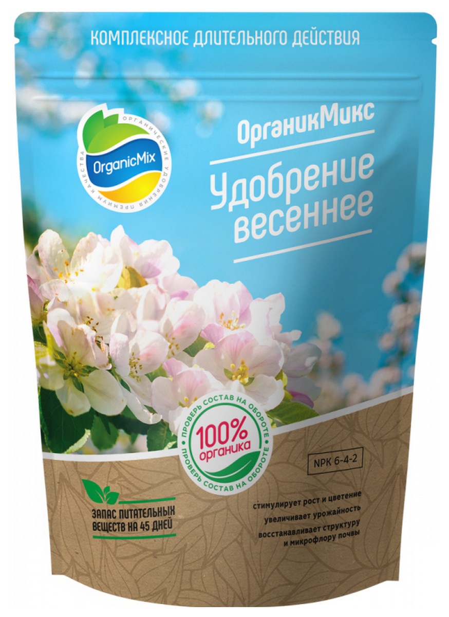 Комплексное гранулированное удобрение весеннее Органик Микс, содержащее все необходимые макро- и микроэлементы в органической форме для формирования мощной корневой системы, гармоничного вегетативного роста, обильного и пышного цветения, завязывания плодов. Натуральные компоненты в грануле, благодаря почвенным бактериям, раскрываются постепенно и обеспечивают растение всем необходимым питанием. Своевременное внесение Весеннего удобрения поможет Вашим растениям быстро восстановиться после зимы и восполнить дефицит питательных веществ как раз к началу вегетационного периода. Внесение Весеннего удобрения позволяет корневой системе Ваших растений быстро наращивать активную корневую массу. Это существенно сказывается на скорости развития, пышном цветении и обильном плодоношении, а также способности с легкостью переносить неблагоприятные условия в течении летнего сезона.