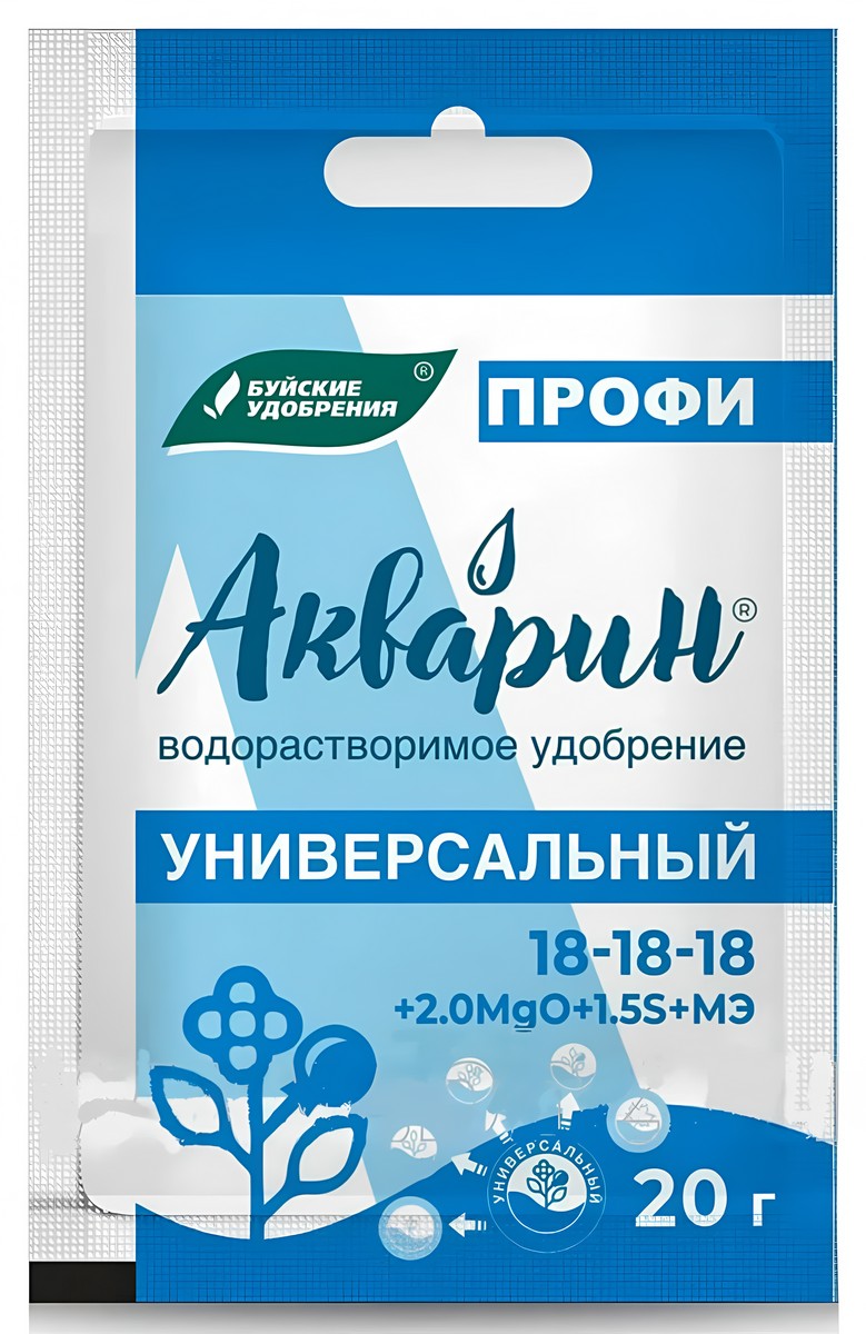 Акварин Профи универсальный - водорастворимое удобрение, в состав которого входит азот, фосфор, калий и микроэлементы – железо, цинк, марганец, медь в хелатной форме, а бор и молибден – в минеральной. Благодаря кислой реакции (рН) удобрения, оно легко растворяется в холодной воде и более эффективно усваивается корневой системой или листовой поверхностью растений. Водорастворимое комплексное минеральное удобрение с фитогормонами предназначено для жидких подкормок различных растений в период вегетации. Равновесная марка обеспечивает растение азотом, фосфором, калием и микроэлементами, что положительно сказывается на ростовых процессах, цветении и плодоношении. Введение в удобрение регуляторов роста группы гиббереллинов (GA) и цитокининов (CK) позволяет стимулировать ростовые процессы, провоцировать растяжение клеток, поддерживать равномерное деление клеток и активизировать фотосинтез.