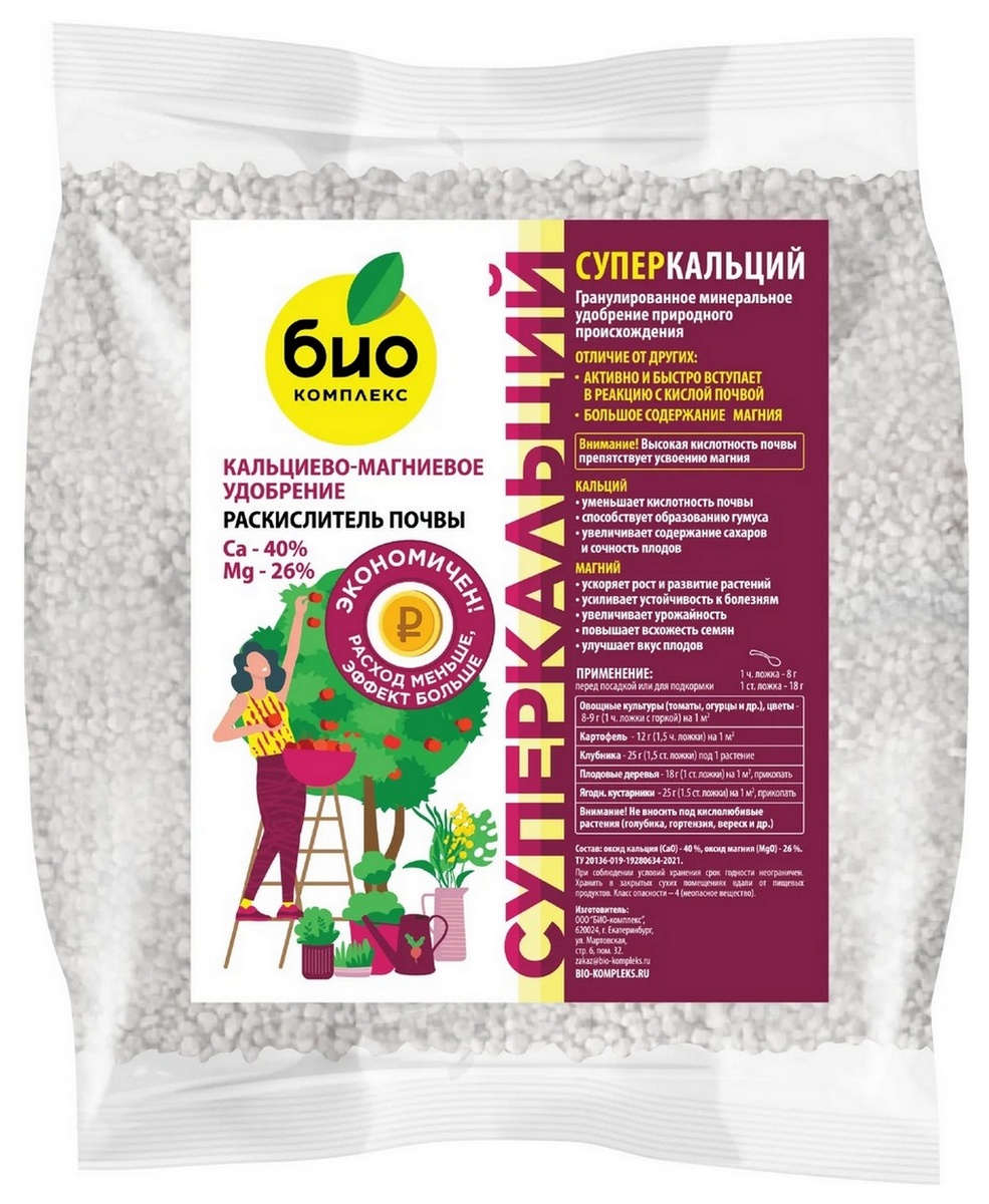 СуперКальций - легко усваиваемое гранулированное минеральное удобрение природного происхождения. Активный источник важнейших для растений микроэлементов – кальция и магния. Быстро и эффективно раскисляет почву, делая ее идеальной для выращивания большинства плодовых культур (исключение – кислолюбивые растения, например, голубика). СуперКальций гораздо активнее вступает в реакцию с кислой почвой по сравнению с традиционными раскислителями. Результат: расход меньше, эффект больше. Удобрение безопасно для растений, животных и людей.