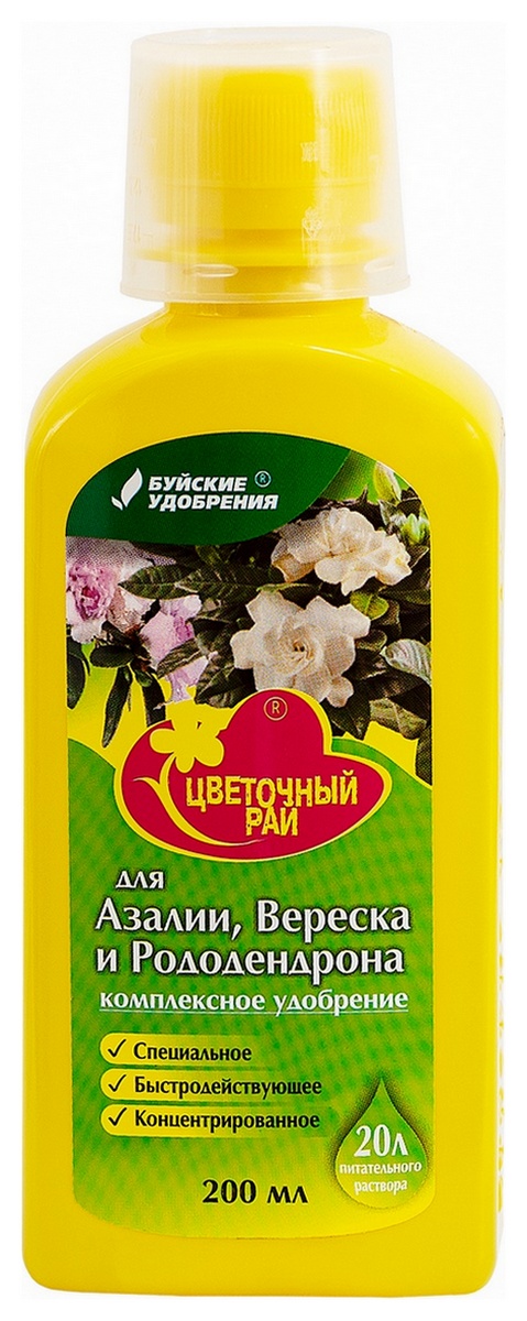 ЖКУ "Цветочный рай" для азалии, вереска и рододендрона - это сбалансированный комплекс высокоэффективных, легкодоступных для растений микроэлементов – Fe, Mn, Zn, Cu, в виде сложных органических солей – хелатов, а также B, Mo. За счет этих элементов способствует здоровому росту и развитию растений. Стимулирует развитие побегов, сочной зеленой листвы, обильного и длительного цветения. Устраняет видимые проявления дефицита элементов питания, предотвращает развитие болезней, вызванных недостатком тех или иных микроэлементов. На практике садоводам затруднительно вносить микроэлементы отдельно. Внесение их в составе «Цветочный рай» существенно упрощает этот процесс, а так как они содержатся в физиологически выверенных пропорциях, нет риска излишнего внесения.