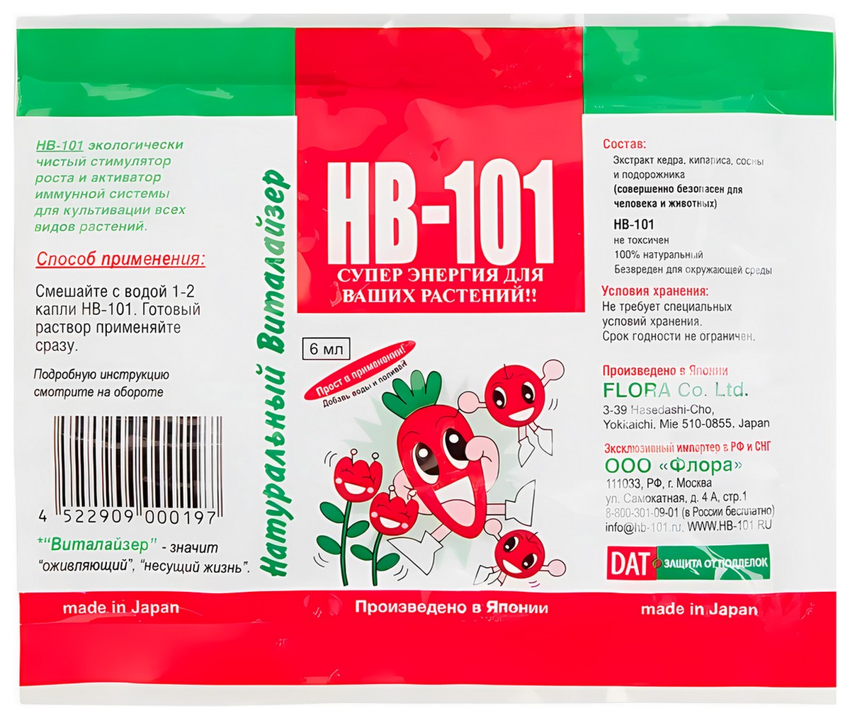 Биопрепарат "НВ-101" — это концентрированный состав в коллоидной форме для культивации растений, выработанный из вытяжек японского кедра, кипариса, сосны и подорожника. Это стимулятор роста и активатор иммунной системы растений. Вырабатывается из соков деревьев (кедр, сосна, кипарис) в момент их наиболее энергичного роста. НВ-101 помогает растению наиболее полно использовать свой внутренний потенциал и ресурсы окружающей среды. Препарат "НВ-101" улучшает всхожесть семян и увеличивает энергию роста, повышает защитные силы организма, повышает устойчивость к неблагоприятным условиям, повышает сохранность урожая, оздоравливает почву.