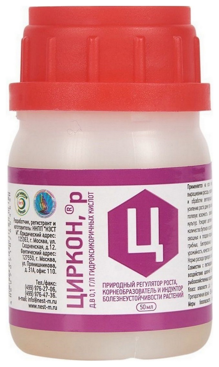 Циркон - природный регулятор негормонального происхождения, получен из Эхинацеи пурпурной. Его основу составляет комплекс гидроксикоричных кислот и их производных, которые стимулируют ростовые процессы, защищают от стрессов и составляют систему жизнеобеспечения растений. Гидроксикоричные кислоты принимают активное участие в дыхании растений, открытии и закрытии устьиц, защищая клетки от УФ-в излучения и засухи. Циркон увеличивает всхожесть семян, особенно некондиционных; укореняет рассаду, черенки, однолетних и многолетних хвойных и лиственных культур. Защищает от биотических и абиотических стрессов, предотвращает опадение завязей, плодов. Снижает развитие и распространение болезни на различных культурах: фитофтороз картофеля и томатов, пероноспороз огурцов, паршу картофеля и яблони, бактериоз, фузариоз, корневые гнили, особенно серую гниль земляники, мучнистую росу различных сортов роз и чёрной смородины, монилиоз косточковых и т.д. Совместим с пестицидами.