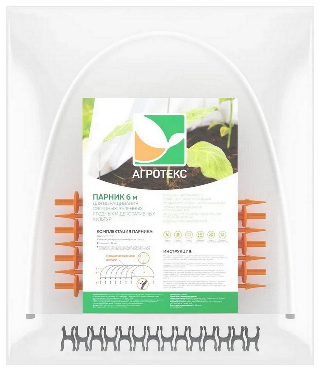 Парник Агротекс обязательно пригодится на приусадебном участке, даже если имеется стационарная теплица. Парник Агротекс отличается легкостью установки и мобильностью конструкции. Нетканый укрывной материал имеет специально прошитые карманы для дуг, за счет чего пользоваться парником очень удобно. Полипропилен хорошо пропускает воздух и влагу, но при этом позволяет создать комфортный микроклимат внутри мини парника. Данное приспособление помогает снизить сроки созревания овощей или фруктов, повысить урожайность и уберечь саженцы от поздних заморозков, сильного ветра или других неблагоприятных условий. В комплект входят дуги, колышки, укрывной материал и клипсы для его крепления к дугам.