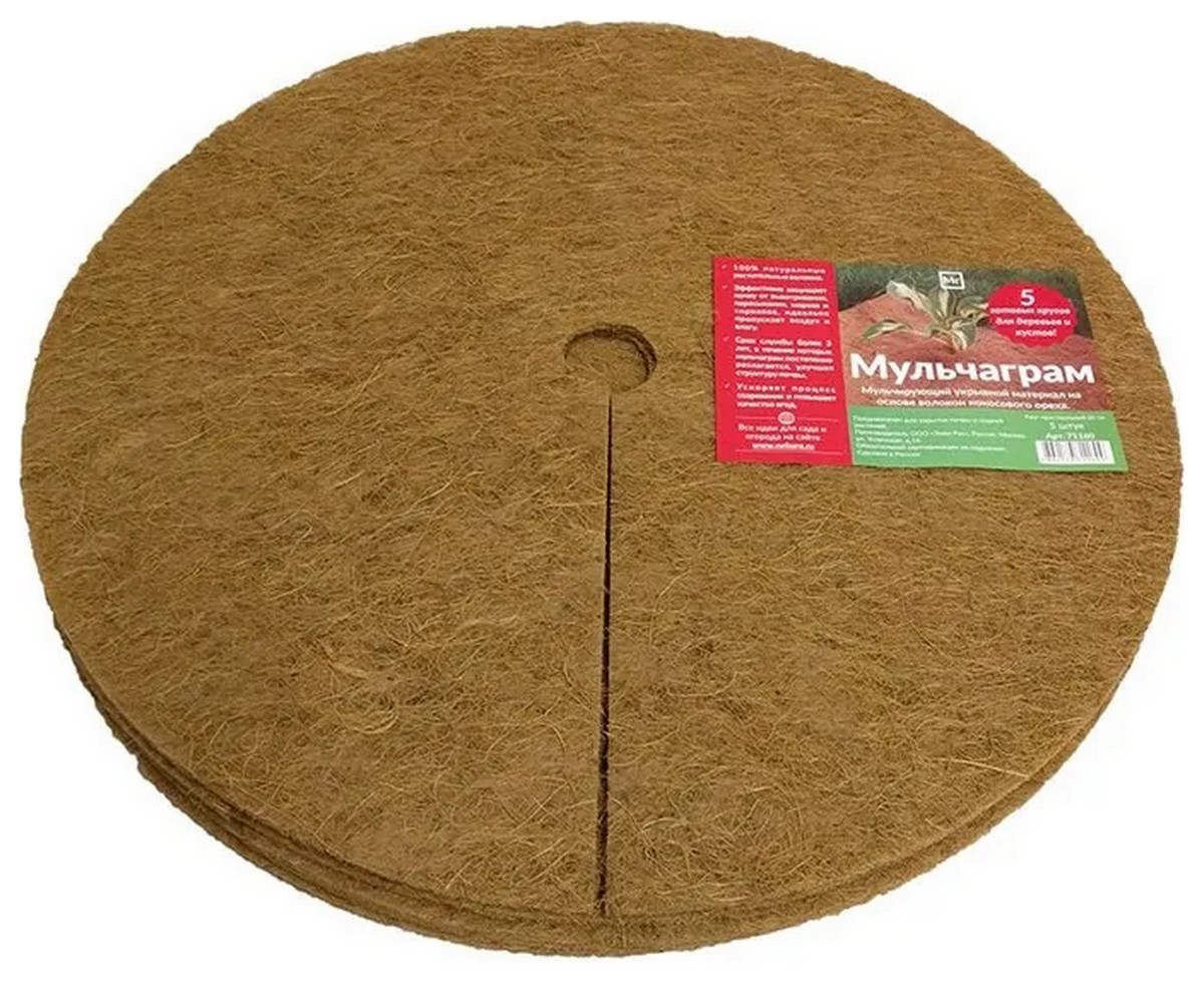 Мульчаграм – экологичный укрывной, мульчирующий материал толщиной 7 мм на основе волокон кокосового ореха, размер круга в диаметре 60 см, в комплекте 5 шт. Приствольный круг сделан из 100% натуральных растительных волокон без клея и пропитки, пропускает воздух и влагу, защищает почву от выветривания и пересыхания, срок службы 3-5 лет, постепенно разлагаясь улучшает структуру почвы. Не окисляет почву, рН нейтральный. Препятствует развитию патогенных бактерий. Сдерживает рост сорняков. Ускоряет и повышает плодоношение. Защищает корни растений от морозов и перегрева. Посадки будут выглядеть эстетично и ухоженно. Материал легко режется ножницами. Мульчаграм используют для оформления приствольных кругов растений, грядок, цветников, горшечных растений; для защиты почвы от выветривания, пересыхания; для выращивания клубники, ускоряет созревание и повышает качество ягод; для утепления на зиму стволов и корней растений.